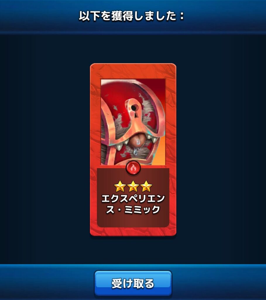 ↑なんと無料で配布されていた100枚のバザーコインを使ってバザーサモンを回したところ、なんと1発でエクスペリエンス・ミミック(炎)が出ちゃいました!!