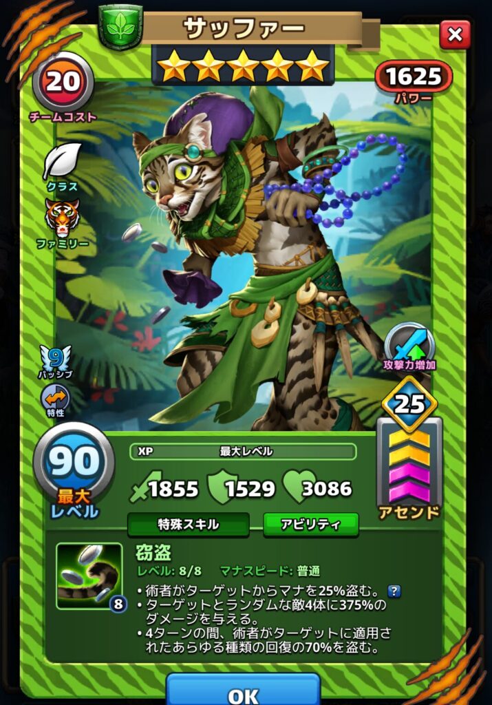 (キャラクター1体に1ターンの間、特殊スキルにより5直接マナが追加され、以後、特殊スキルによって直接マナが追加されるたびに、そのキャラクターのパワーが減少する。)