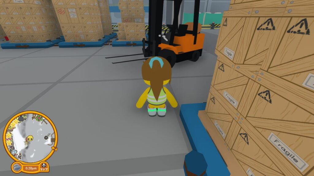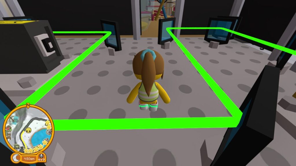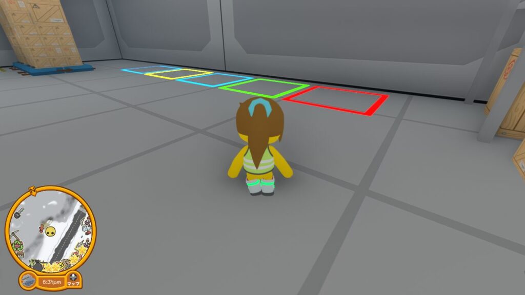 研究所の奥のパレットに木箱がたくさん積まれているゾーンに向かいます。すると奥に水色黄色の、4色(水色は2か所)の四角形のマーキングがある場所があります。