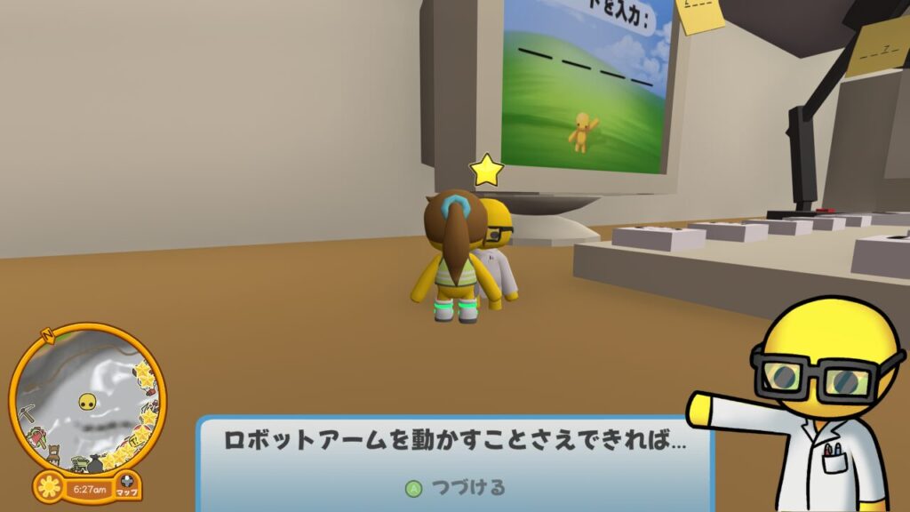 棚のキーボード横にいる3人目の科学者を見つけると、4人目の科学者を助けるには隣にあるロボットアームを動かす必要があると告げられます。