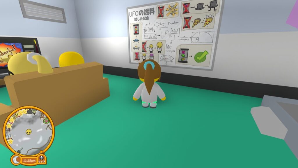最後の部品であるUFOの燃料は、先ほどのヒューズ獲得の項目で紹介した壁のヒントを基にして、サイエンスの仕事で使った燃料配合マシンを使って作り出します。