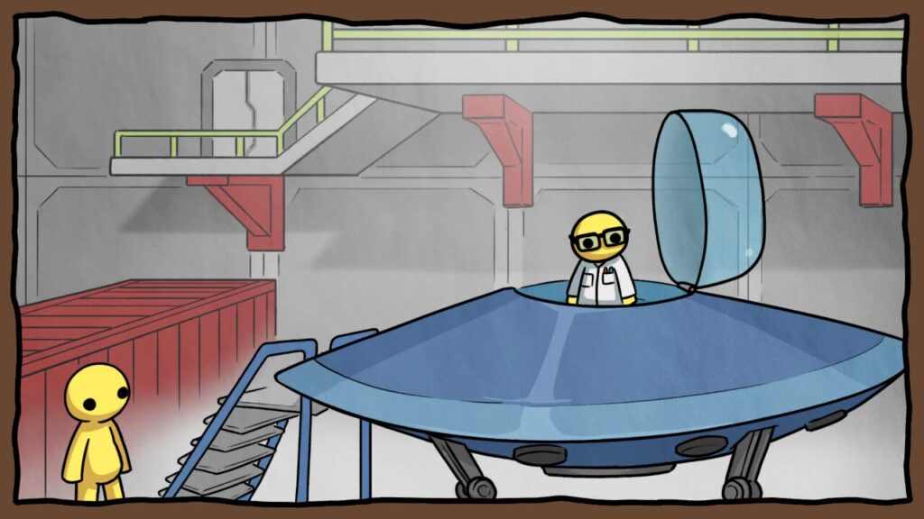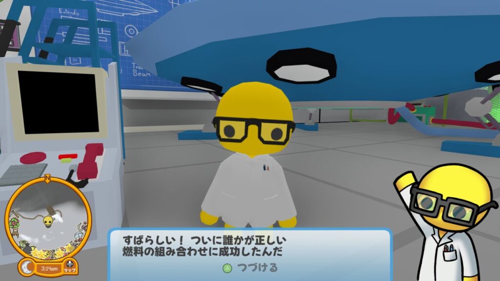 無事壁のヒント通りに燃料を作り、タスク開始位置の科学者ウォブリーまで運べれば、ついに念願のUFOの完成です。
