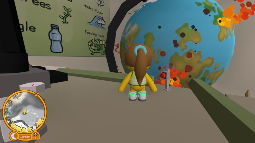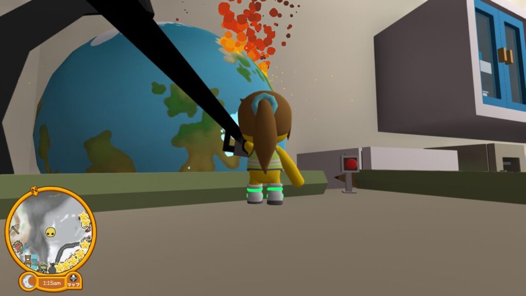 ↑研究所の燃える地球儀は研究所のラボで小さくなった後、角にある地球儀のあるテーブルから始められます。上のスクショ画面の奥に見えている場所です。