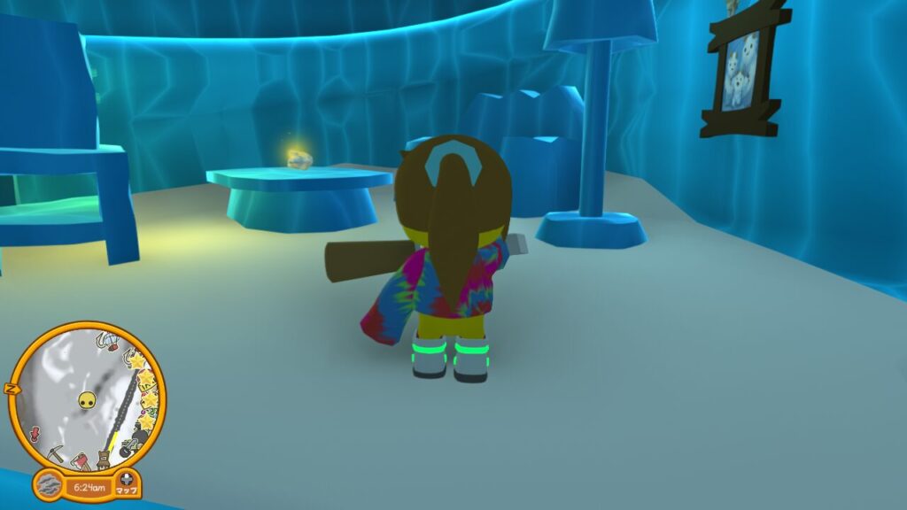 ペンギンの氷像と同時進行を目指す方は、大型動物の毛皮とノミを握ったまま再度氷の洞窟の入り口まで戻り、氷漬けウォブリーから向かって右に進んだ先にある【折れたノミがある部屋】に行きます。