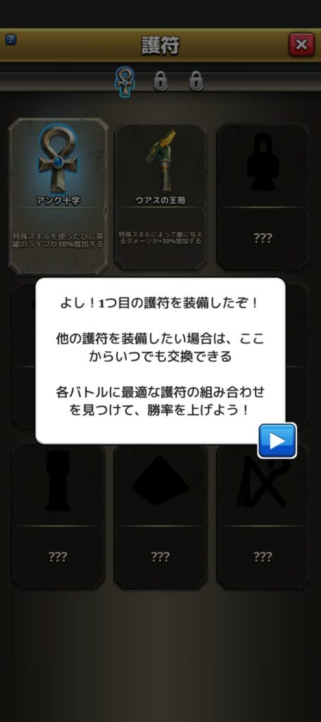 この護符は様々な種類があり、それぞれかなり効力が違うので、自身のチームにあった護符や、ステージに合わせて着脱するのがオススメです。