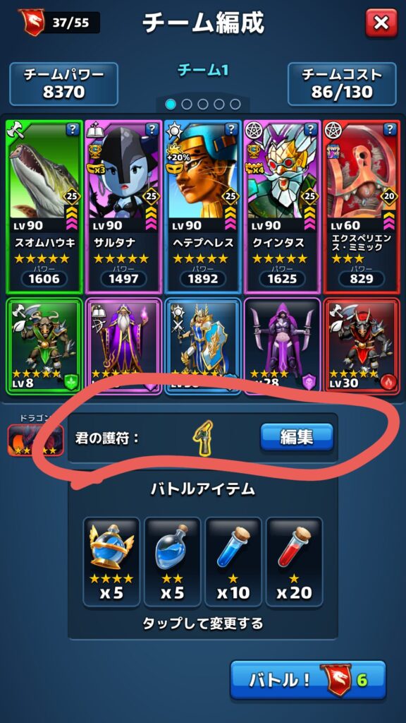 ↑ちなみにステージ開始直前のチーム編成画面からでも護符は編集可能です。