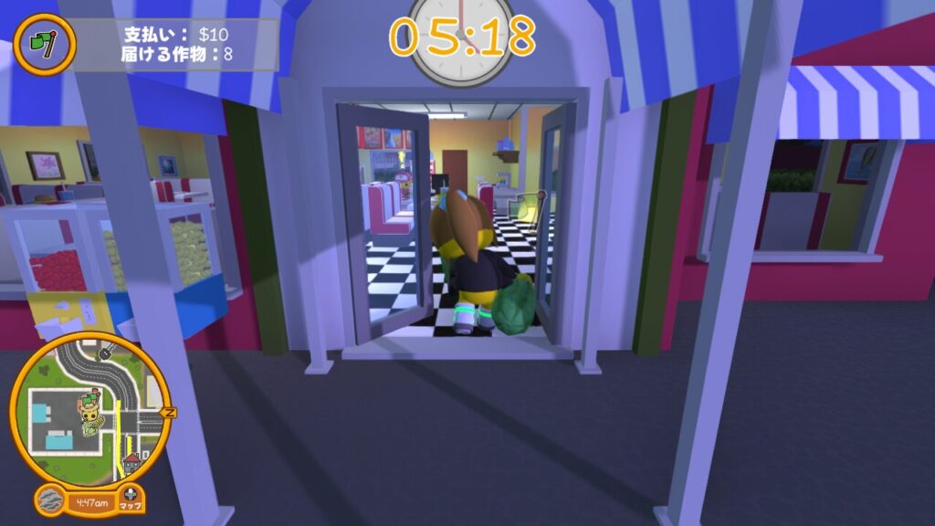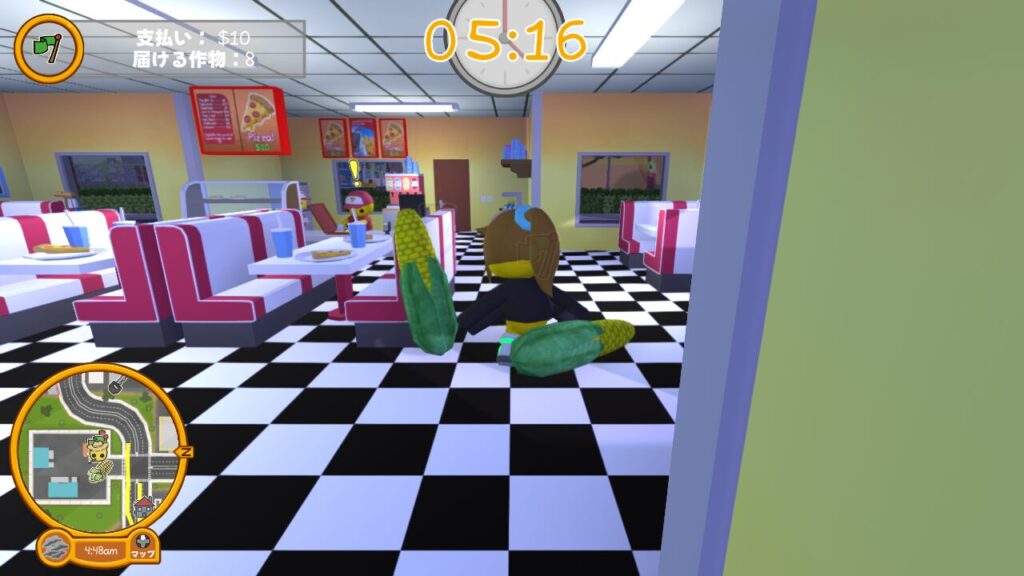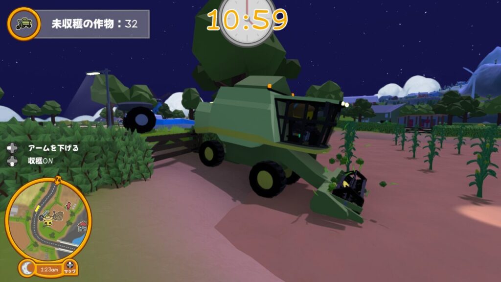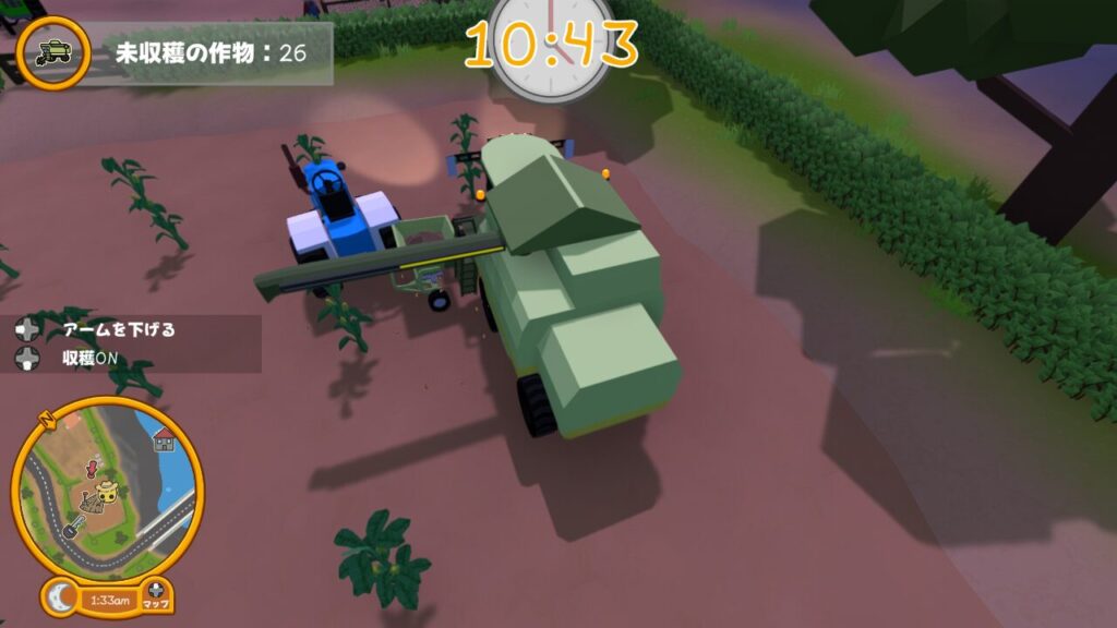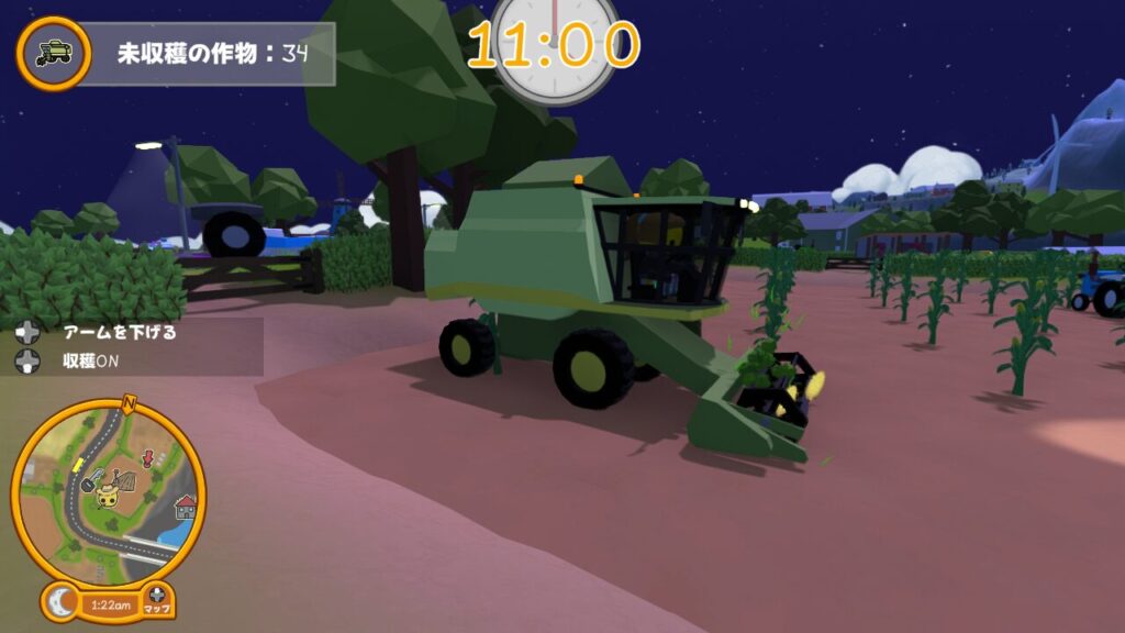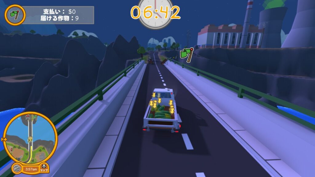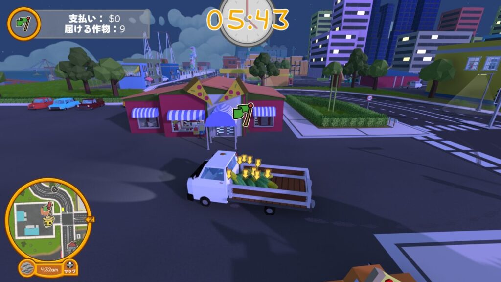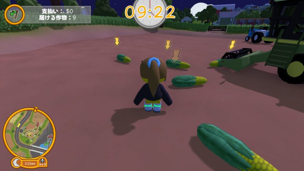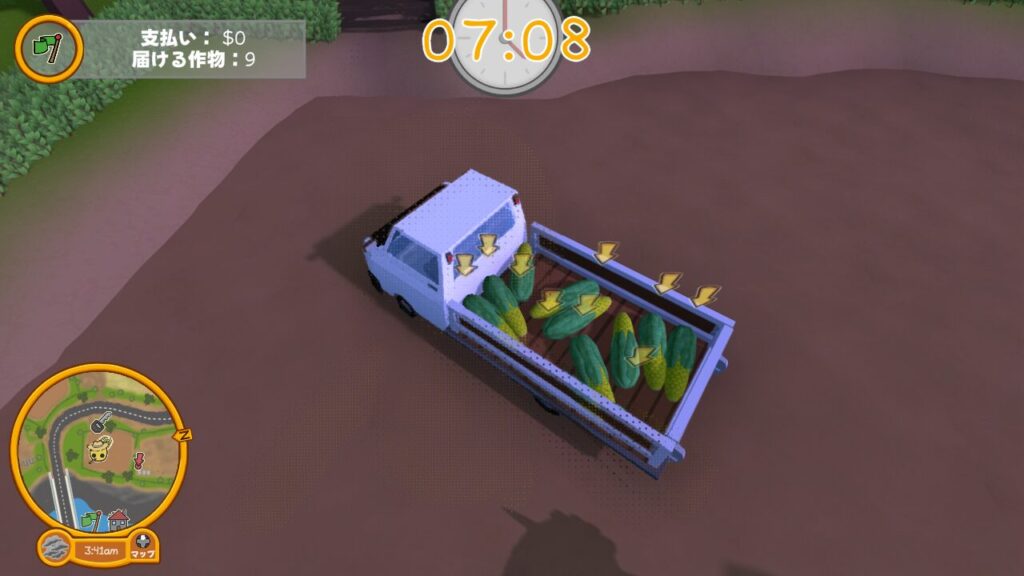 落ちてる作物(今回はトウモロコシ)を適当なトラックに積み込み、届け先まで制限時間内に運びます。