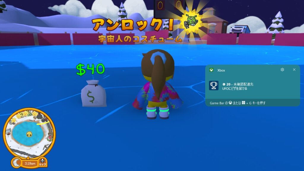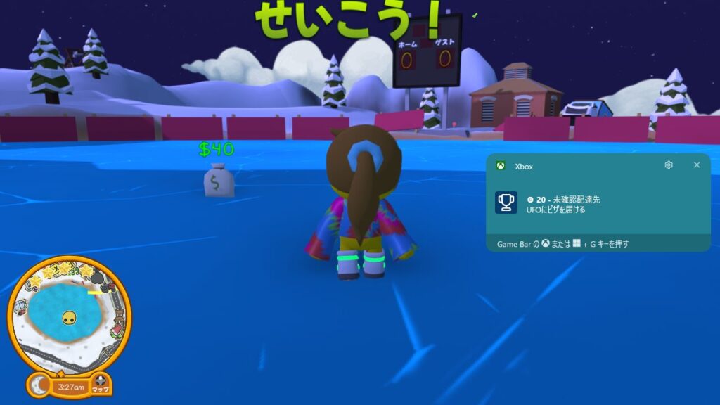 と言う事でなんとか無事にUFOの吸い込み口へピザを放り込めたので、お仕事せいこう!となり、実績(トロフィー)の【未確認配達先】がアンロックされ、賃金の40ドルもGETできました。