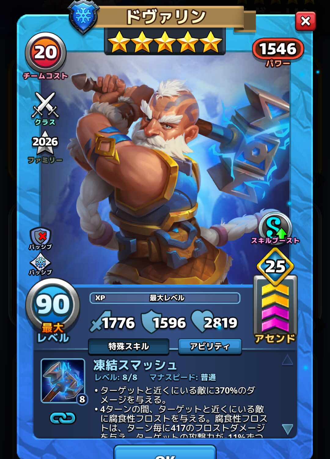 ・4ターンの間、ターゲットと近くにいる敵に腐食性フロストを与える。腐食性フロストは、ターン毎に417のフロストダメージを与え、ターゲットの攻撃力が-11%ずつ減少する。ミニオンまたはメガミニオンを所有する英雄には追加ダメージを付与する。