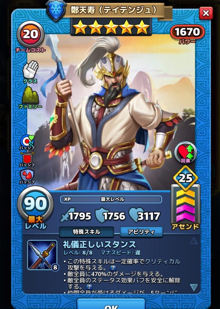 鄭天寿(テイテンジュ)のアビリティとパッシブスキルは以下の通りです。※達人アビリティ開放した場合