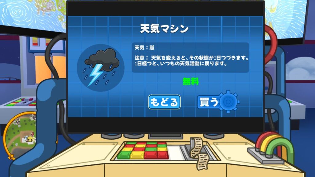 天気マシンをアンロックできれば、いつでも好きな天候に変える事ができちゃいます。