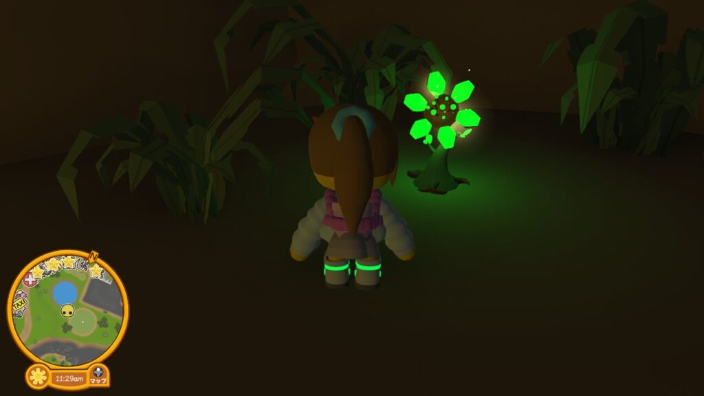 奥に進むとなにやら怪しくグリーンの光を放つ花のような物が…。