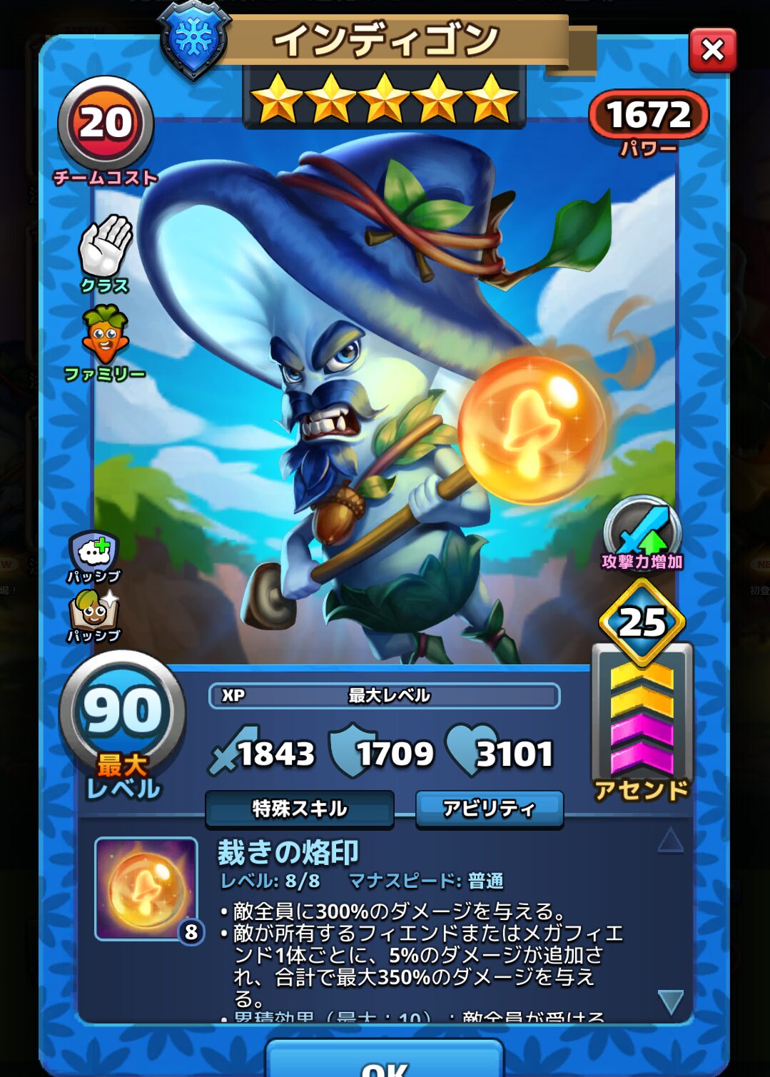 ・累積効果(最大:10):仲間全員のマナ生成が+4%になる。(タイルをマッチさせて作りだすマナか、防御チームがターン終了時に獲得したマナにのみ影響を及ぼす。)