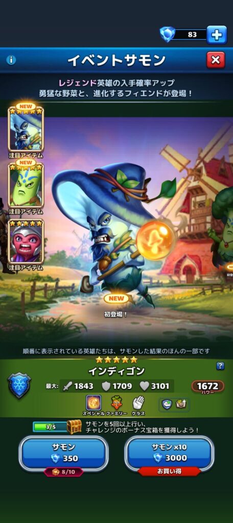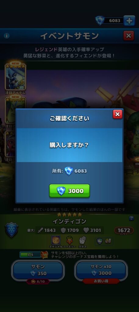↑勇猛な野菜ファミリーの超強力星5英雄であるインディゴン。今回はそんなインディゴンやブロセフが入手できるイベントサモンを、なんと23回連続でサモンしてみました。