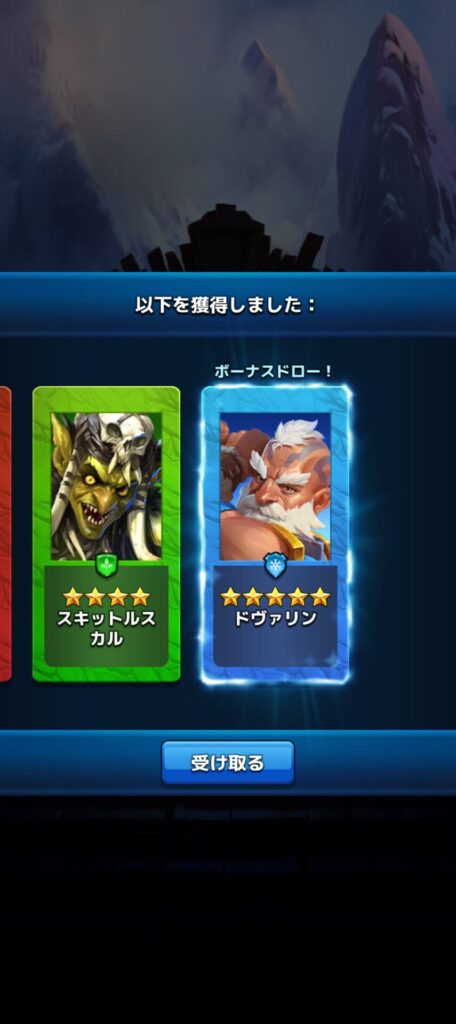 ドヴァリンのボーナスドローがかろうじて入ったのだけが救いですが、残念ながら勇猛な野菜ファミリーの星5英雄は1体も出ませんでした…。