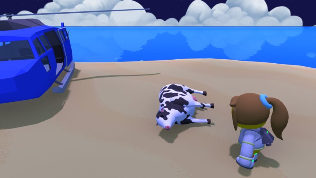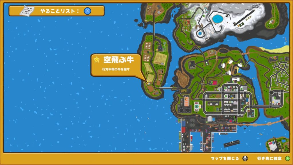 マーガレットという牛が車にはねられ、海の向こうに飛んで行ってしまったらしく、その牛を探すタスクとなります。