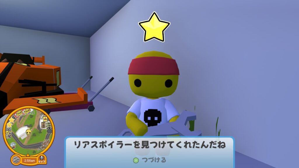 レーストラックを走行中に車のパーツを4つも落としてしまったらしく、それを探して拾ってきてくれないかという内容のタスクになります。