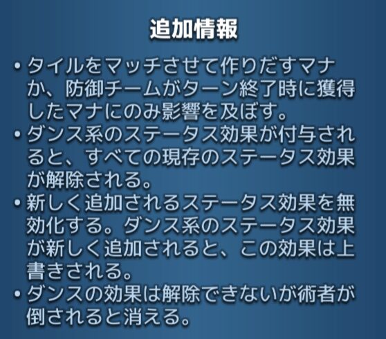このキャラクターが特殊スキルを発動するたびに、敵全員に対する攻撃、防御、マナ生成に作用するあらゆる解除不可のバフがそれらに応じた解除不可のステータス異常に変化する。
