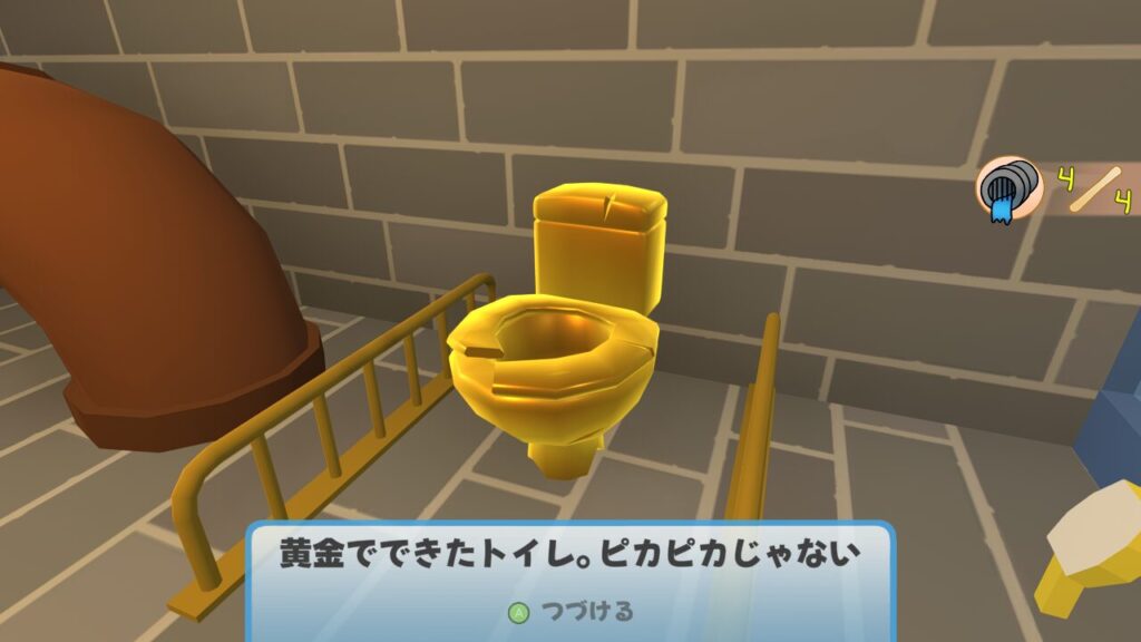 奥に進むと黄金でできたトイレが落ちてますので回収して脱出しましょう。