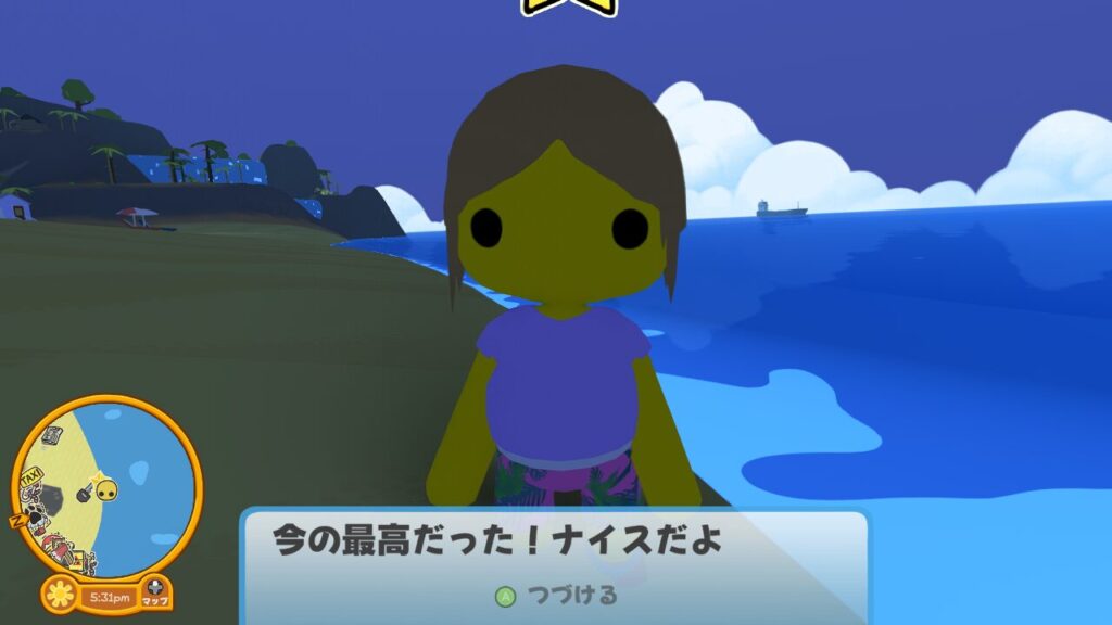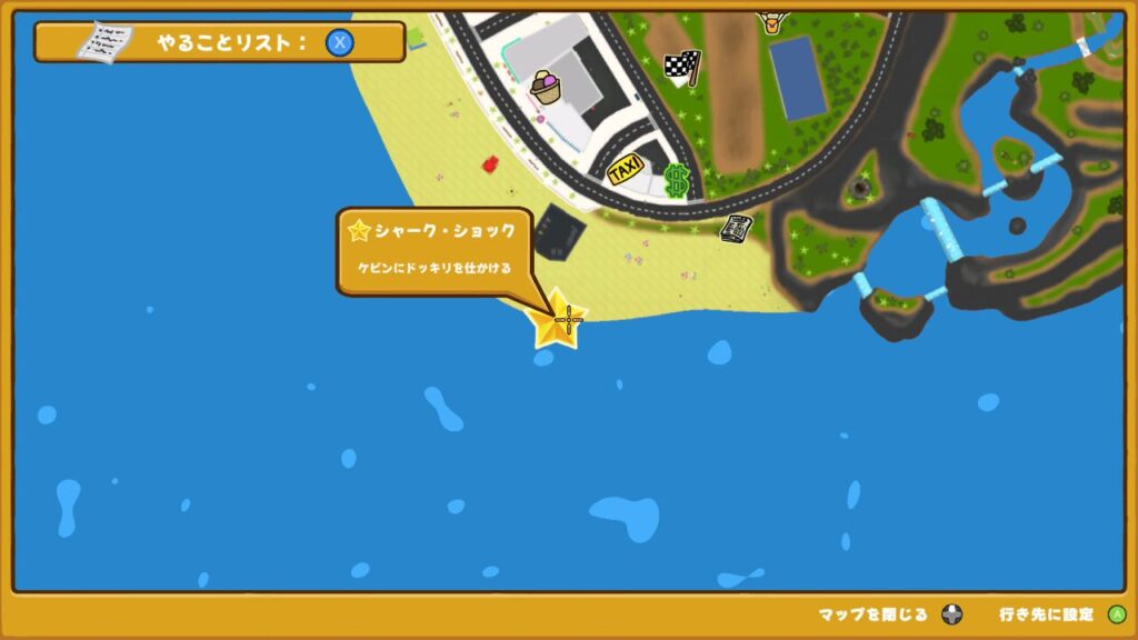 ↑シャークショックのタスクは、パラダイス島のビーチエリアのこの場所から開始する事ができます。