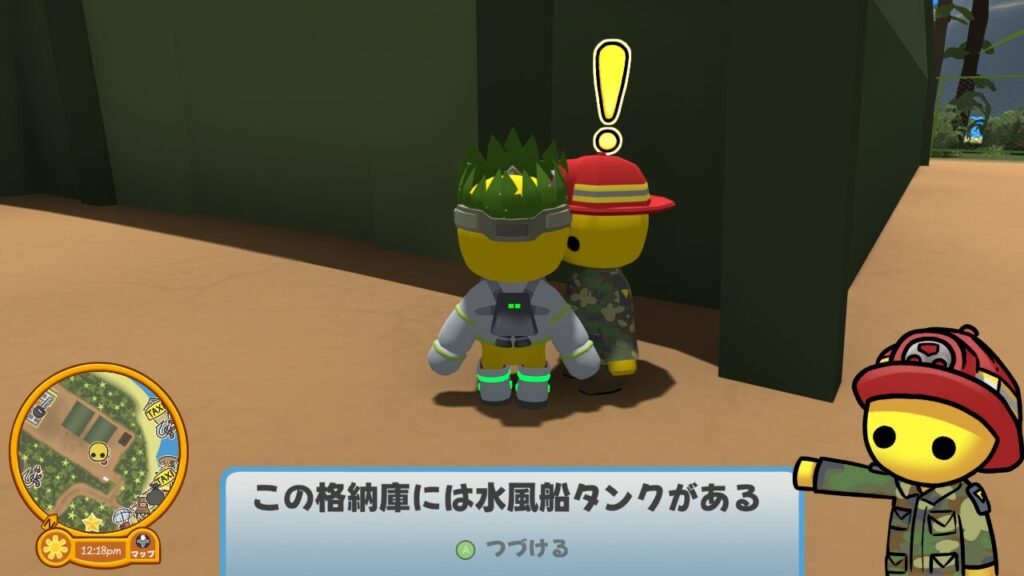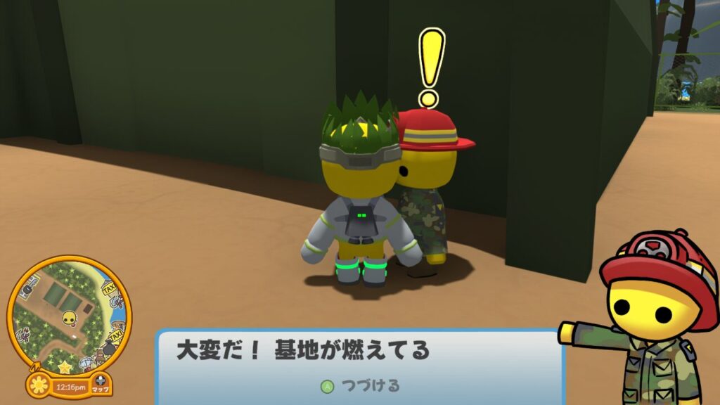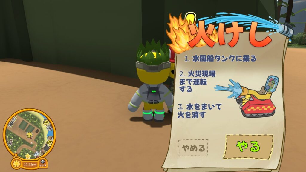 ↑お仕事を請けられる時間に行くと、消防司令官の頭上にビックリマークが出ているので、このタイミングでインタラクトしましょう。