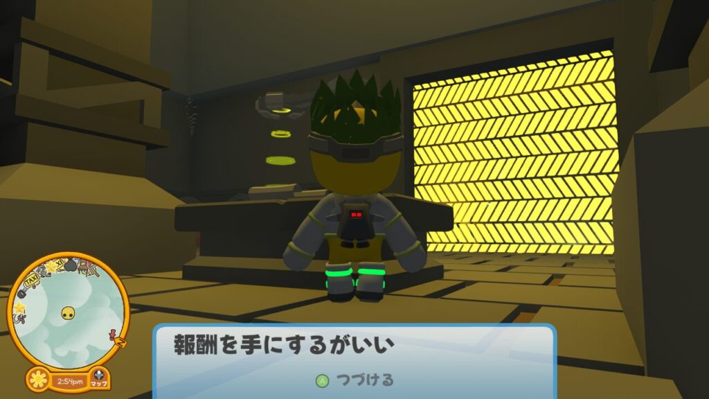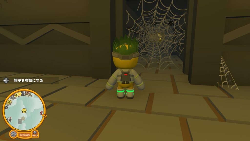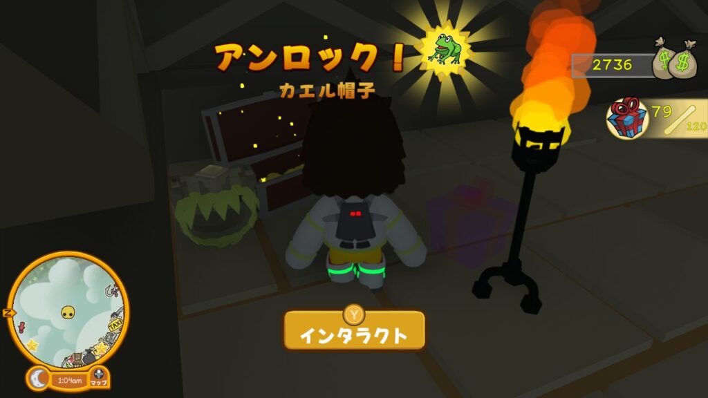 すると秘密の洞窟脱出用のエレベーターがある部屋につきます。エレベーター横には【カエルの帽子】というコスチュームとプレゼントボックスが入った宝箱があるので、忘れずに取得しましょう。