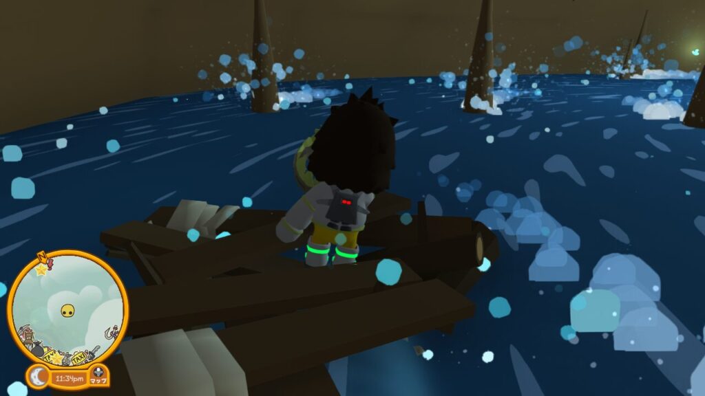 そのイカダ(の残骸)に乗り少しの間流されていると、向こう岸に飛び移るタイミングがきますので、タイミング良くジャンプして渦ゾーンを越えましょう。