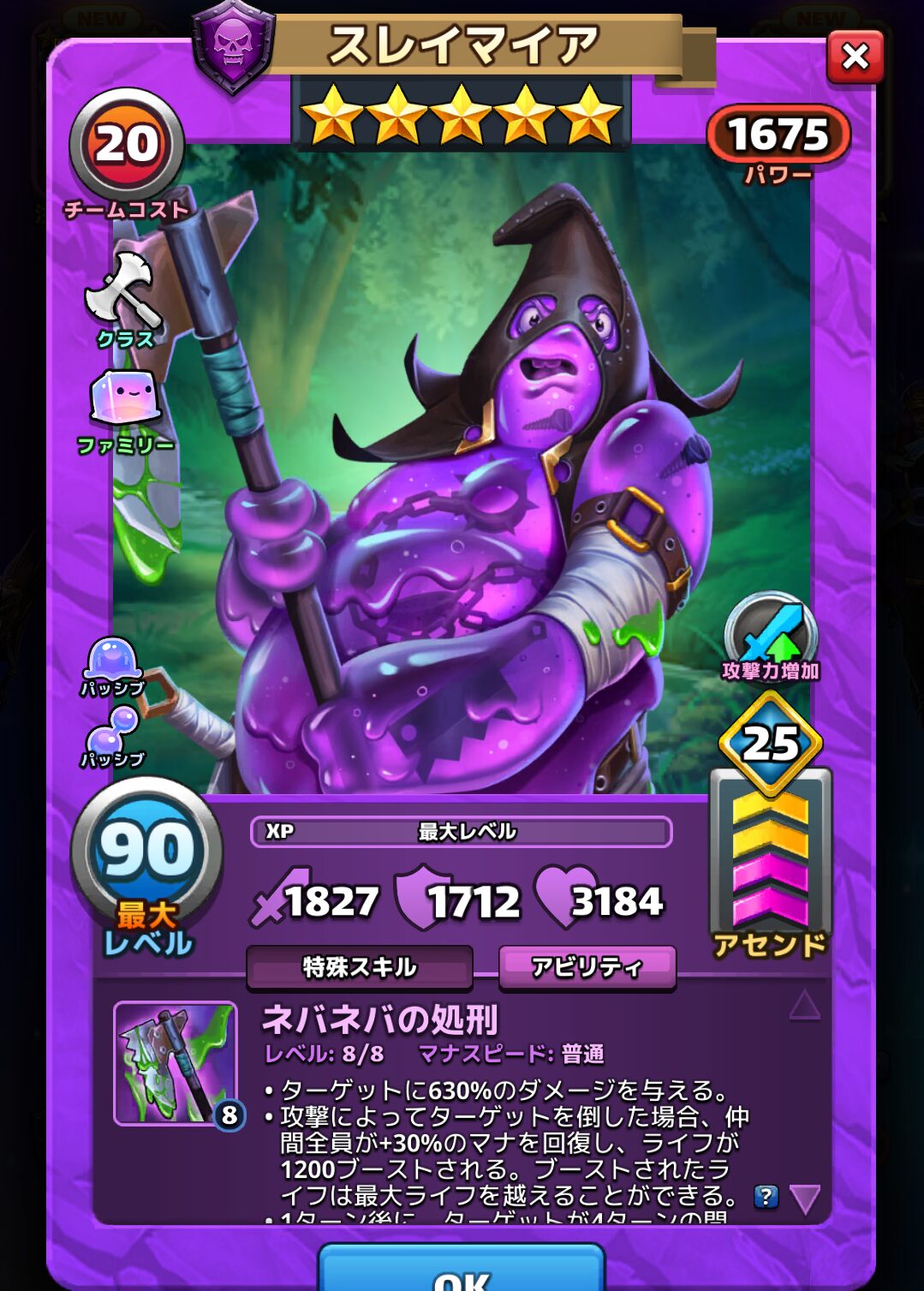 ・仲間がサモンしたメガミニオン、ミニオン、フィエンドが、チーム内にいるスライムファミリーの英雄の数に応じて+10%/+15%/+20%の攻撃力を得る。
