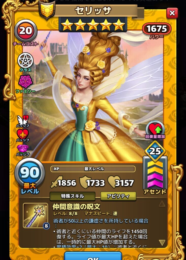 セリッサのアビリティとパッシブスキルは以下の通りです。※達人アビリティ開放した場合
