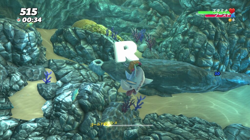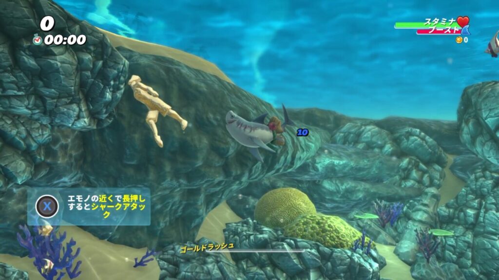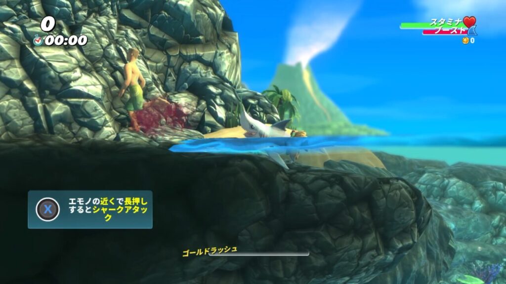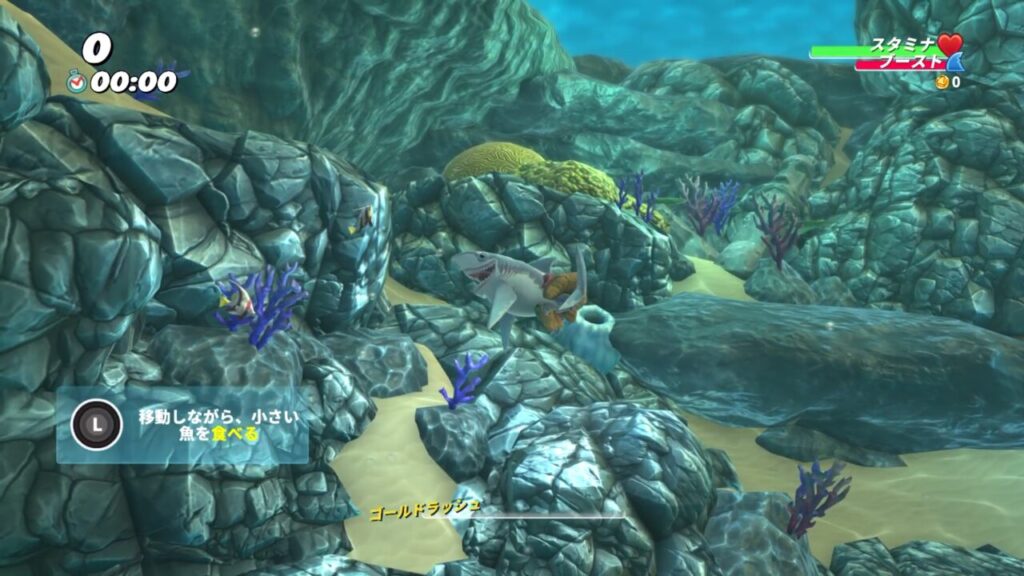ハングリーシャークワールドの操作方法は実にシンプルで、スティック操作での移動、シャークアタック(噛みつき)、ダッシュくらいしか覚える操作はありません。