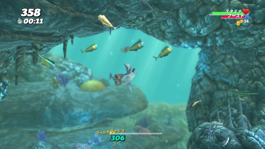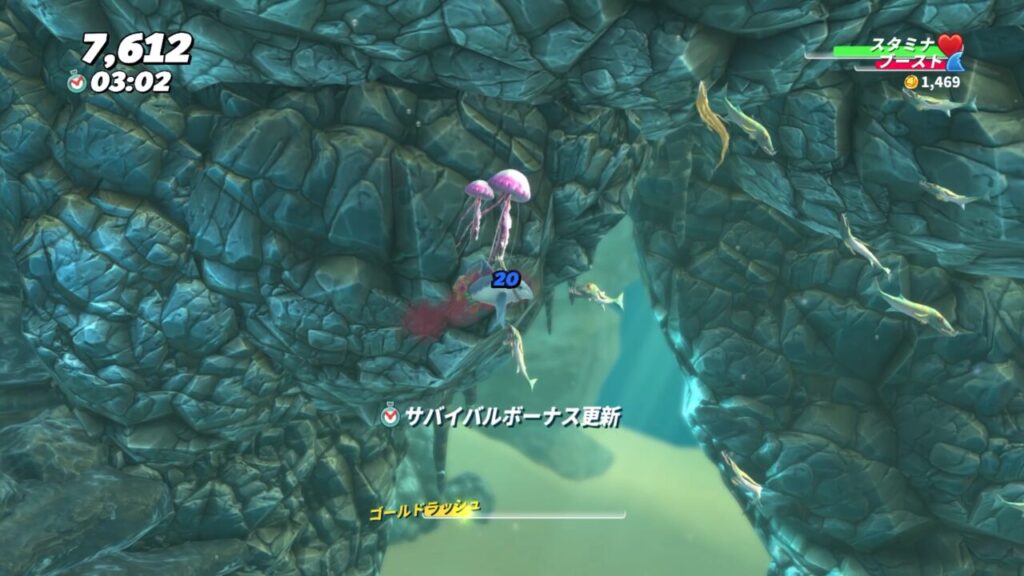 プレイヤーが操作するサメ以外のサメや、攻撃的な魚たちもこちらにダメージを与えてくる。