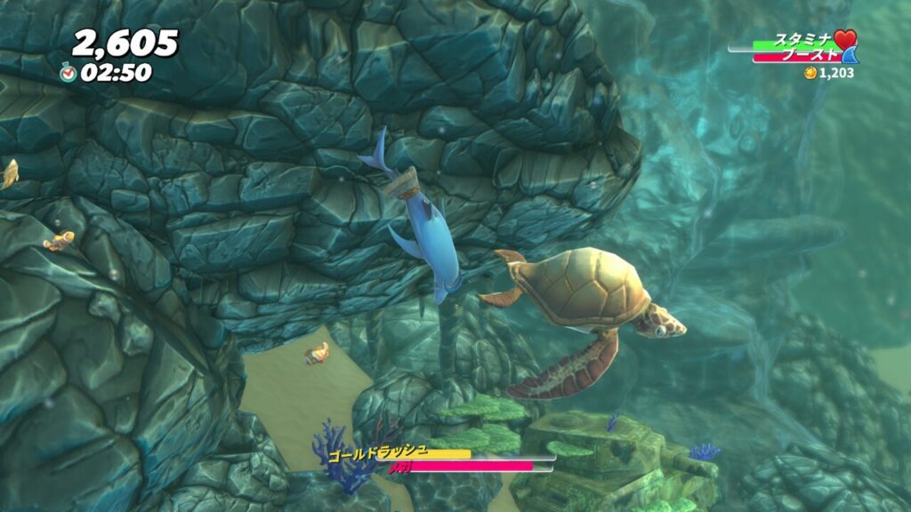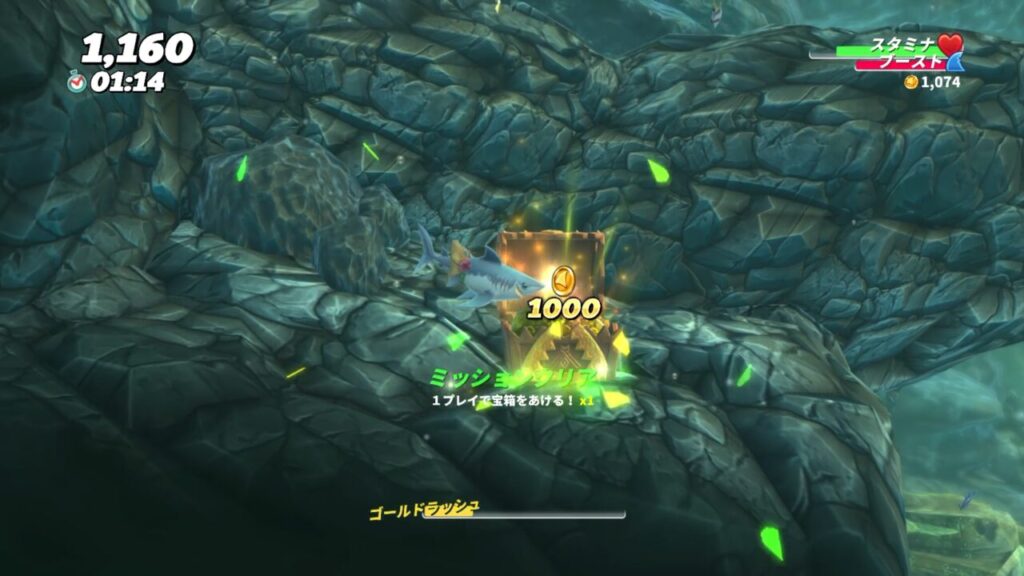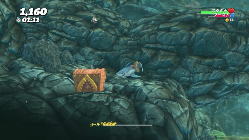 ハングリーシャークワールドの美しい海中には宝箱があったり、