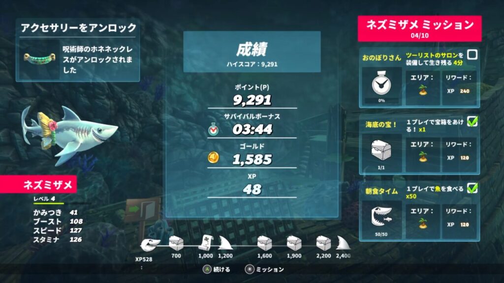 ハングリーシャークワールドではステージが終了するとリザルト画面に移行し、成績やミッション、獲得経験値などが確認できる。