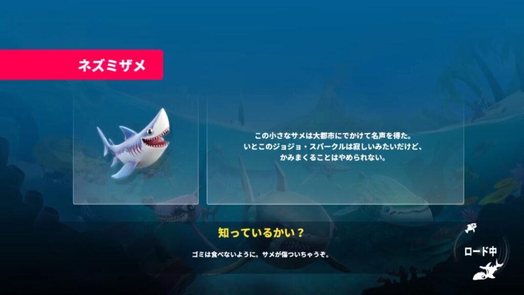 ハングリーシャークワールドのロード画面では、サメに関する豆知識や、開発チームの小ネタなどが紹介されるので、楽しみながらロードを待つ事ができる。
