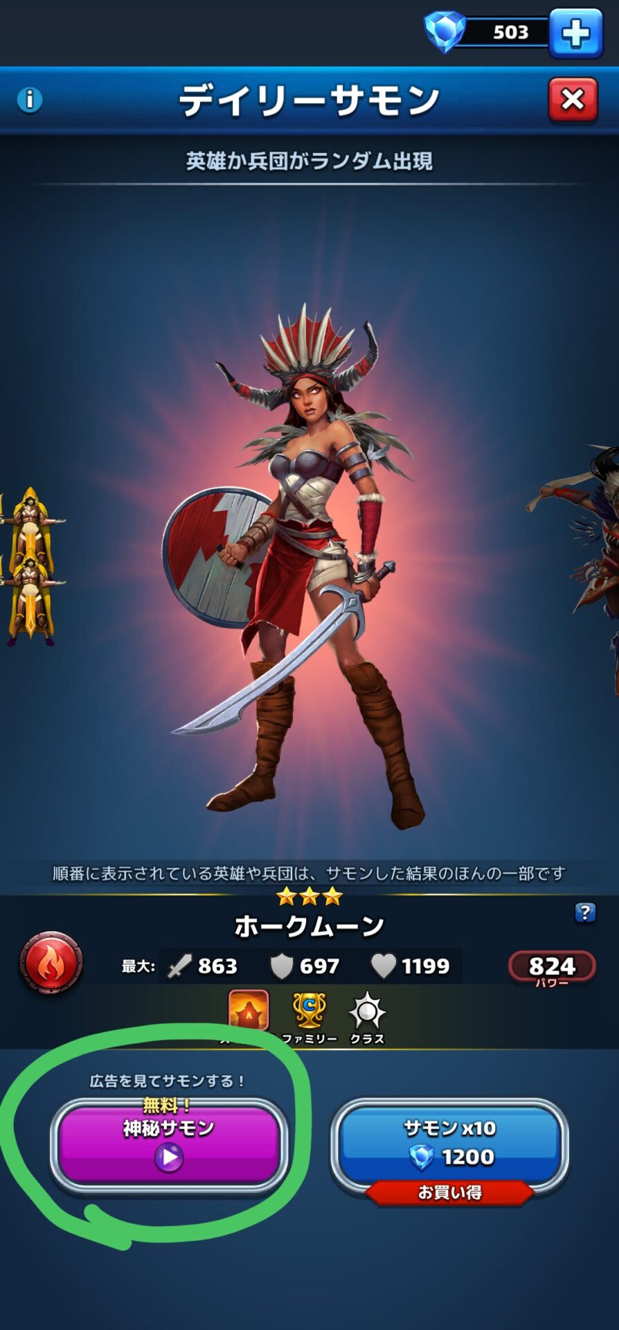 ↑しかもなんとデイリーサモンの神秘サモンは、1度の広告視聴で3回自動でひいてくれます。