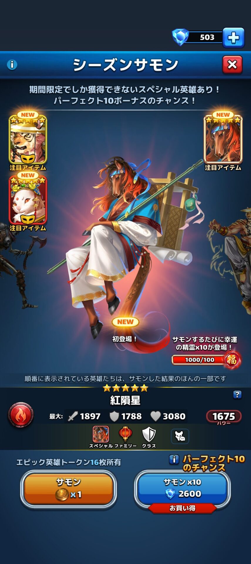 旧正月ファミリーの超強力星5英雄である紅隕星が出る今回のシーズンサモン。今回はそのシーズンサモンを旧正月の乱闘で得たエピック英雄トークン×15枚+元からあった1枚で、16回連続でサモンしてみました。