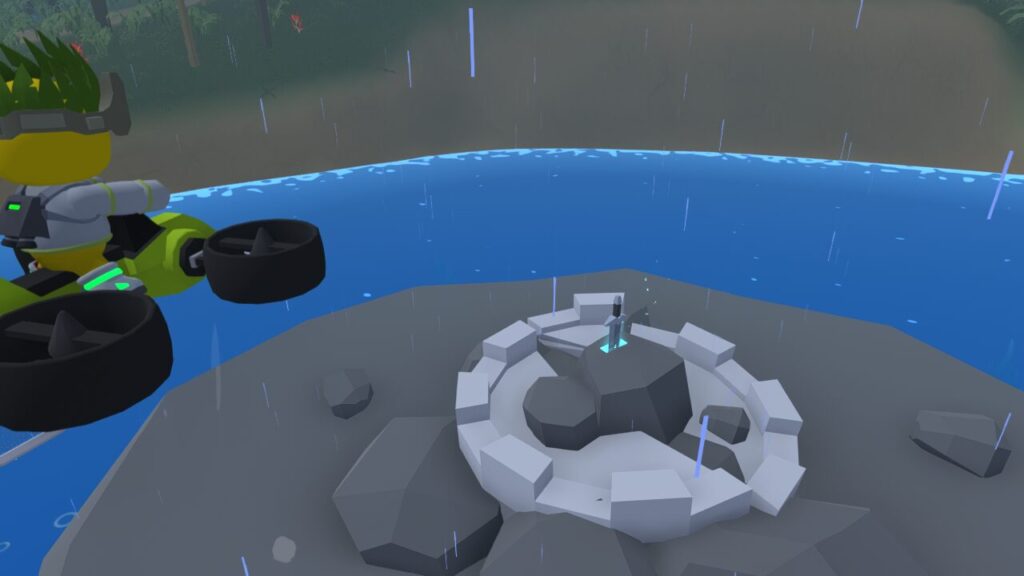 気象研究者の仕事で使ったクアッドコプターに乗りジャングル島を探索していると、釣りができる湖?みたいな場所の中央に、なんと突然小島がせり上がってきました。