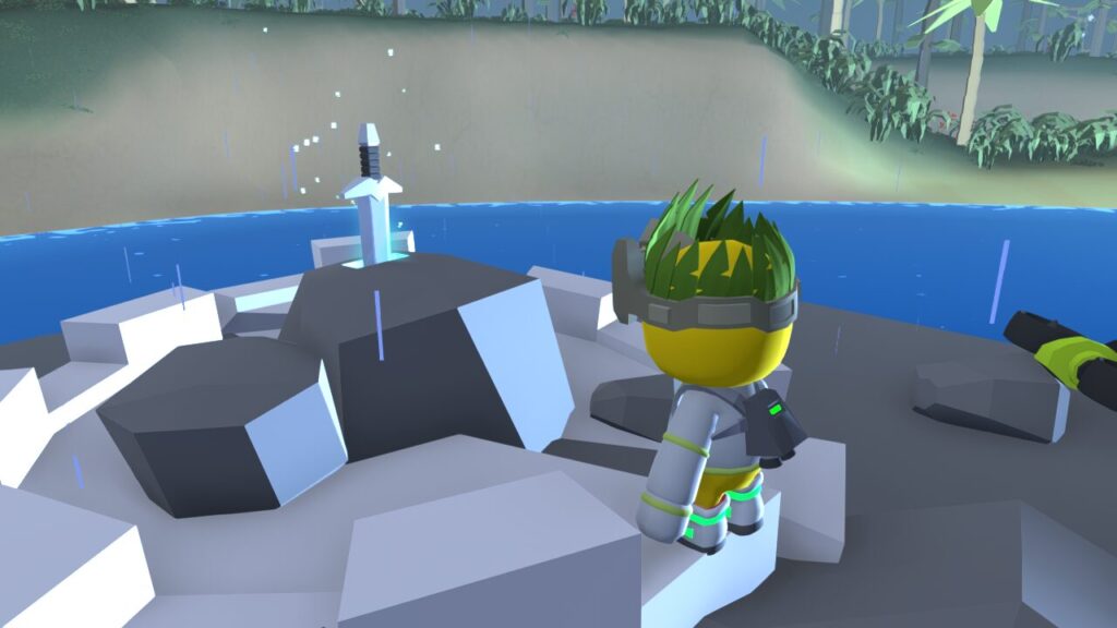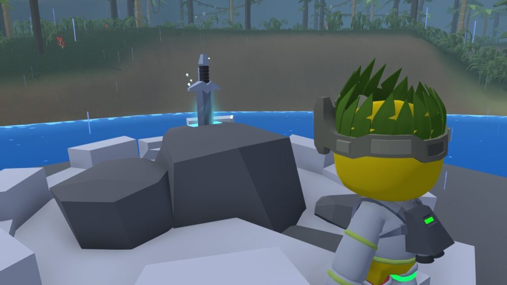 というのもこの剣と島がせり上がって出現したとき、演出っぽく落雷が剣に直撃したんです。