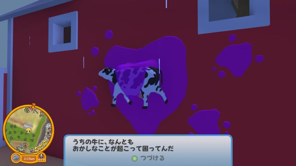 今回の事件は農場からの通報で始まります。現場には謎の物質(紫のねばねば)が残されていたそうですが…。