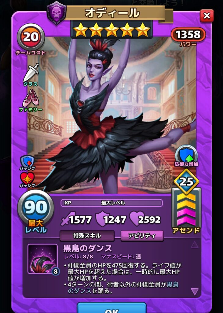 オディールの特徴スキルは非常に優れており、パッと見の回復量は少なく見えてしまいがちですが、マナスピード速で仲間全員に黒鳥のダンスを踊らせる事ができるのはかなり魅力的です。