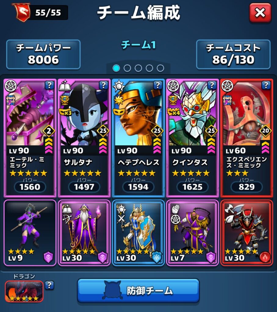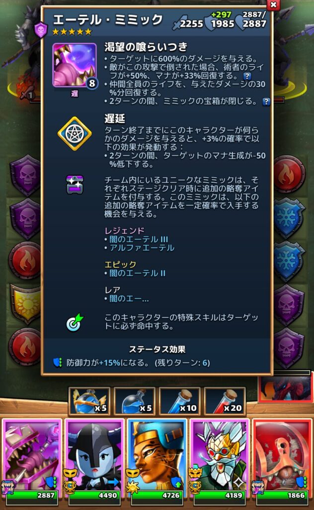 ↑というわけで星5のエーテルミミック(闇)と、星3のエクスペリエンスミミック(炎)を同じチームに入れてマップをまわしてみる事にしました。