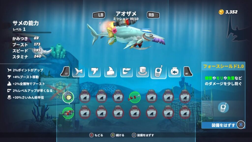 【ハングリーシャークワールド攻略】サメのおすすめ装備まとめ|ジェットパック、フォースシールド、リサイクラーキャノン、レーザー