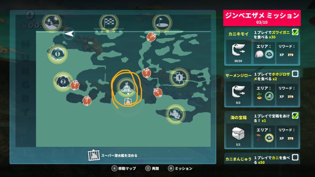 ↑スーパー潜水艦はオレンジ色の丸で囲んだエリアにいます。