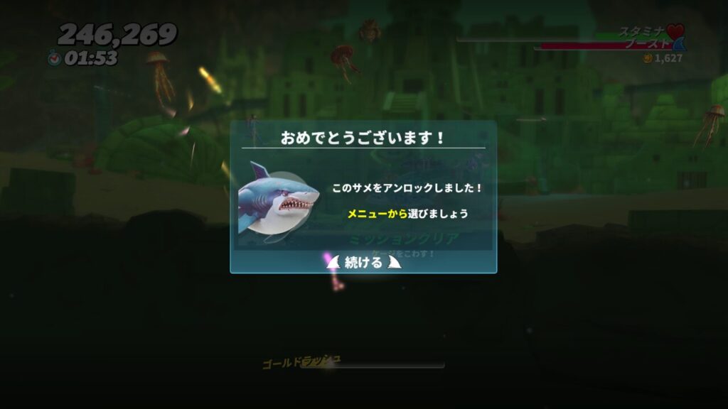 スーパー潜水艦を沈めてケージを壊すと、ホホジロザメという大型のキャラクターがアンロックされます。