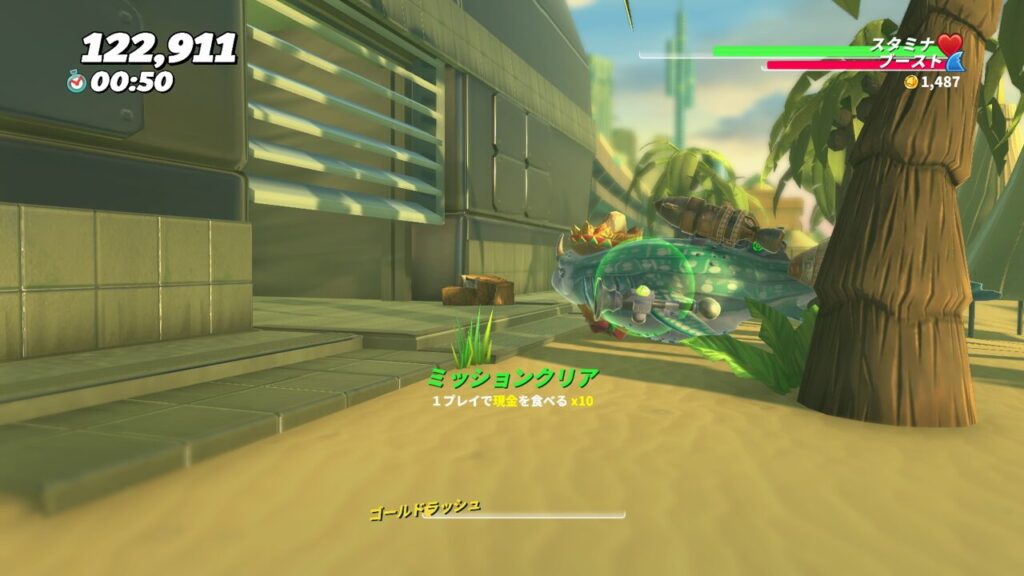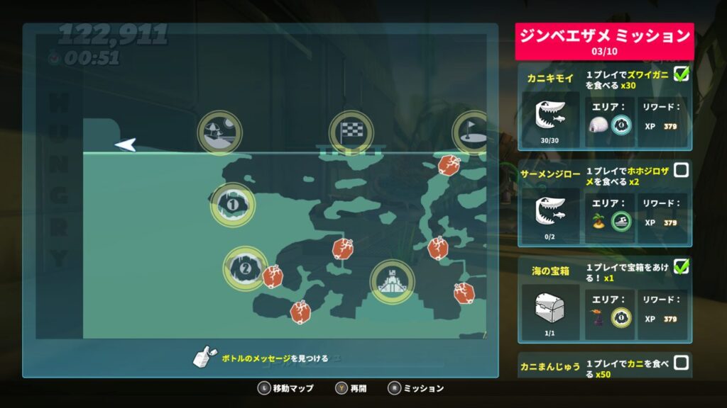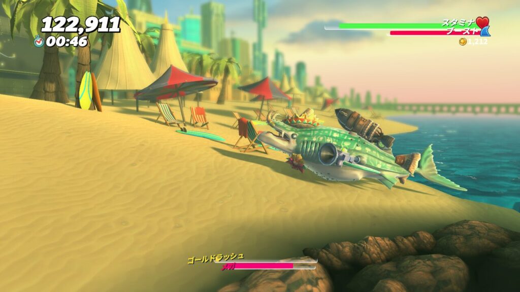 普通に海中を進んでもいけるエリアなのですが、スコアアタック中などには先ほどの陸地の人間を捕食したあとに、海に戻らずこのルートを進む方が効率的である。
