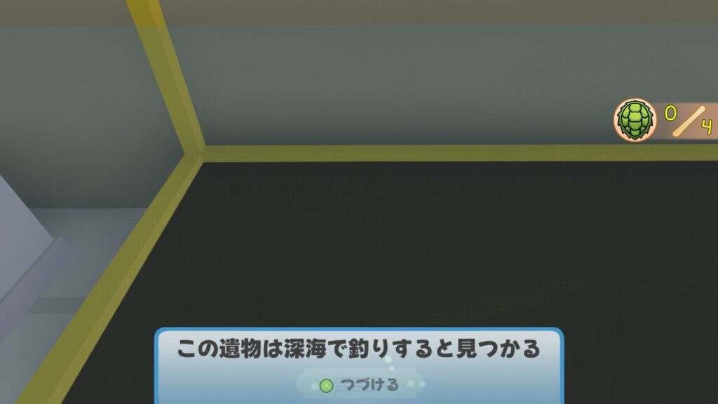↑博物館でのヒントを見ると、「この遺物は深海で釣りをすると見つかる」だそうです…。