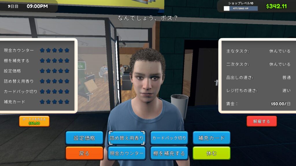↑アルバイトの人物にインタラクトすると細かく業務指示を出したり、ボーナスを出したりなどの設定ができます。