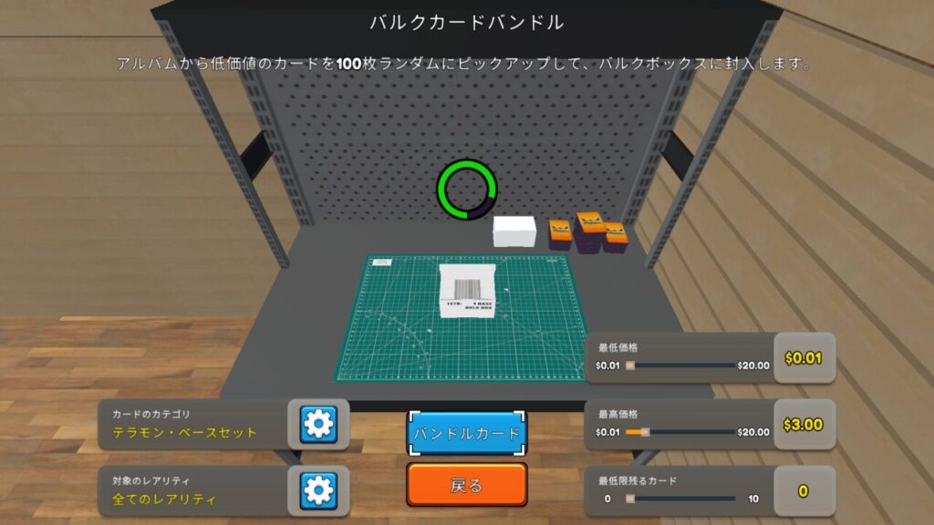 作業台では不要なジャンクカードを束ねる事ができ、完成したバルクを棚に陳列すれば販売する事ができマネタイズする事ができます。