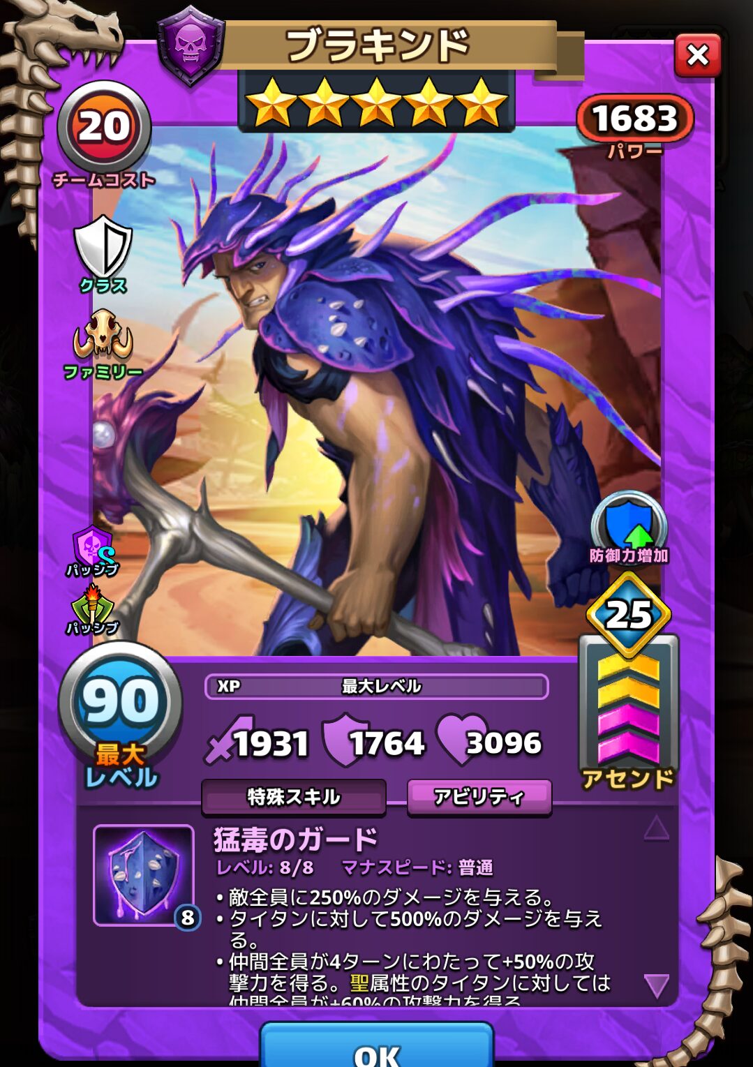 ・仲間全員が4ターンにわたって+50%の攻撃力を得る。聖属性のタイタンに対しては仲間全員が+60%の攻撃力を得る。