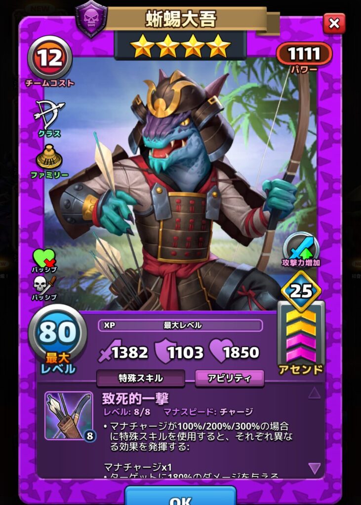 蜥蜴大吾は以下のファミリーに所属する最強レベル星4英雄です。